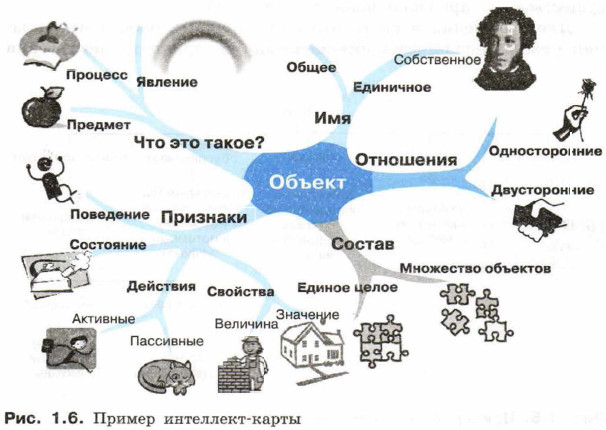 1. В центре листа картинкой или несколькими словами обозначьте основное понятие, возьмите его в рамку или в кружок. 2. От центрального объекта нарисуйте в разные стороны цветные ветви — основные связанные с ним понятия, свойства, ассоциации. Подпишите каждую ветвь одним-двумя словами (надпись должна быть разборчивой). 3. Рисуя интеллект-карту, применяйте как можно больше цветов и как можно чаще используйте рисунки. 4. От каждой ветви нарисуйте несколько более тонких веточек — развитие ассоциаций, уточнение понятий, детализация свойств, конкретизация направлений. 5. Смысловые блоки отделяйте линиями, берите в рамку. 6. Связи между элементами интеллект-карты показывайте стрелками разного цвета и толщины. 7. Сначала оформляйте основные идеи, а затем уже их редактируйте, делая карту более понятной и красивой. На рисунке 1.6 представлена интеллект-карта, дающая развёрнутое представление о понятии «объект».