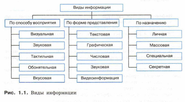 Закон Российской Федерации «Об информации, информационных технологиях и о защите информации» определяет информацию как «сведения (сообщения, данные) независимо от формы их представления». В курсе информатики основной школы мы говорили, что информация для человека — это содержание сигналов (сообщения), воспринимаемых человеком непосредственно или с помощью специальных устройств, расширяющее его знания об окружающем мире и протекающих в нём процессах. Информация обладает такими характеристиками, как объективность, достоверность, полнота, актуальность, понятность, релевантность и др. Информация объективна, если она не зависит от свойств источника информации. Объективную информацию можно получить с помощью измерительных приборов. Отражаясь в сознании конкретного человека, информация перестаёт быть объективной, становится субъективной, т. к. преобразовывается (в большей или меньшей степени) в зависимости от опыта, знаний, пристрастий конкретного человека (субъекта).