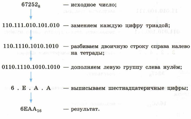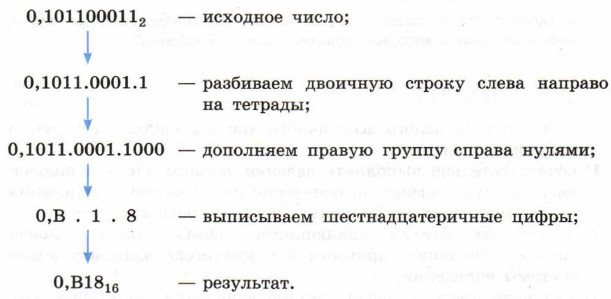 Аналогичные алгоритмы быстрого перевода существуют и для дробных чисел. Для того чтобы записать правильную двоичную дробь в системе счисления с основанием q = 2n, достаточно: 1) двоичное число разбить слева направо на группы по n цифр в каждой; 2) если в последней правой группе окажется меньше n разрядов, то её надо дополнить справа нулями до нужного числа разрядов; 3) рассмотреть каждую группу как д-разрядное двоичное число и записать её соответствующей цифрой системы счисления с основанием q = 2n.