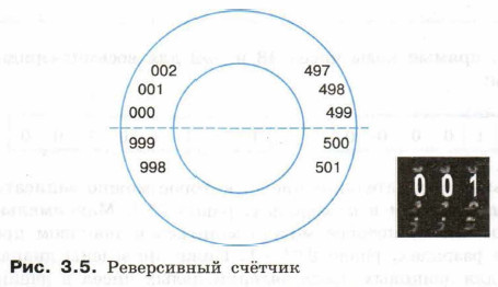 При возрастании показаний счётчика до максимального, например до 999, следующими его состояниями должны быть 1000, 1001, 1002 и т. д. Но для изображения старшей единицы в счётчике не хватает разряда, происходит переполнение разрядной сетки. Поэтому мы увидим 000, 001, 002 и т. д. При убывании показаний счётчика после состояния 000 будут идти 999, 998, 997 и т. д. Но после достижения нуля последовательное вычитание единицы должно давать -1, -2, -3 и т. д. Будем рассматривать числа 999, 998, 997 как коды чисел -1, -2, -3 и проверим на их примере соотношение: у + (-у) = 0: 001 + 999 = 1000;