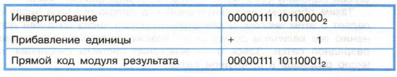 Рассмотрим полученный результат. Это отрицательное число (об этом говорит 1 в знаковом разряде), представленное в дополнительном коде. Перейдём к прямому коду модуля соответствующего числа, по которому сможем восстановить десятичное представление результата. Прямой код можно получить из дополнительного кода, если применить к нему операцию инвертирования и прибавить единицу.