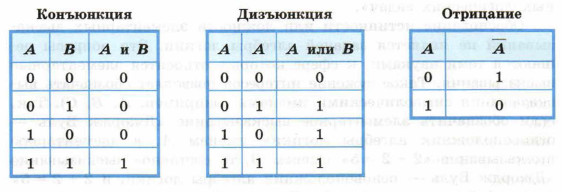 Из курса информатики основной школы вам известны логические операции отрицание, конъюнкция и дизъюнкция. Их таблицы истинности представлены ниже.