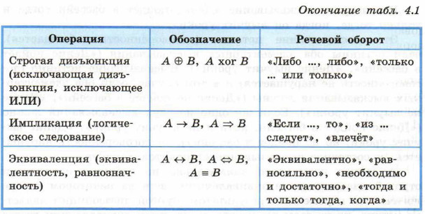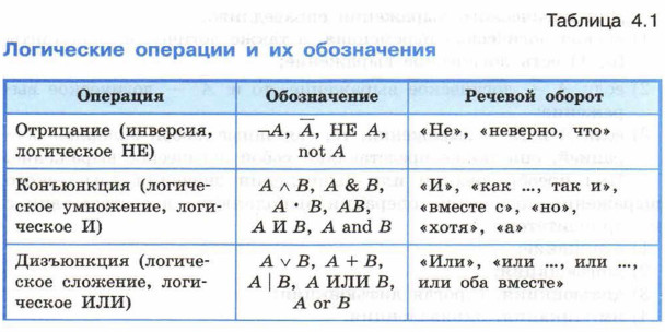 На сегодняшний день в алгебре логики не существует унифицированной символики для обозначения логических операций. В таблице 4.1 представлены логические операции и их наиболее распространённые обозначения, используемые как в алгебре логики, так и в некоторых языках программирования. Здесь же приведены речевые обороты, соответствующие логическим операциям.