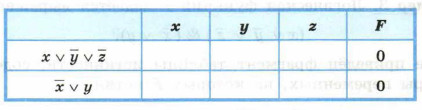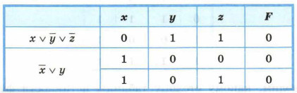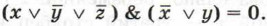 Первая дизъюнкция равна нулю на наборе 011. Для равенства нулю второй дизъюнкции требуется, чтобы х = 1, у = 0, a z может быть и 0, и 1.