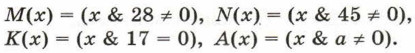 Рассмотрим предикат М(х) = (х & 28 ≠ 0). В числе 28 = 111002 4- й, 3-й и 2-й биты содержат единицы, а 1-й и 0-й — нули. Следовательно, множеством истинности этого предиката являются такие числа х, у которых хотя бы один из битов с номерами 4, 3 или 2 содержит единицу. Если и 4-й, и 3-й, и 2-й биты числа х нулевые, то высказывание х & 28 ≠ 0 будет ложным. Рассмотрим предикат N(x) = (х & 45 ≠ 0). В числе 45 = 1011012 5- й, 3-й, 2-й и 0-й биты содержат единицы, 4-й и 1-й — нули. Следовательно, множеством истинности этого предиката являются такие числа х, у которых хотя бы один из битов с номерами 5, 3, 2 или 0 содержит единицу. Если и 5-й, и 3-й, и 2-й, и 0-й биты числа х нулевые, то высказывание х & 45 ≠ 0 будет ложным. Рассмотрим предикат К(х) = (х & 17 = 0). В числе 17 = 100012 3-й, 2-й и 1-й биты содержат нули, 4-й и 0-й — единицы. Побитовая конъюнкция 17 и х будет равна нулю, если в числе х 4-й и 0-й биты будут содержать нули. Множество истинности этого предиката — все х с нулями в 4-м и 0-м битах. По условию задачи надо, чтобы