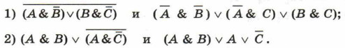 Самое главное. Вопросы и задания § 20. Преобразование логических выраженийСамое главное Способ определения истинности логического выражения путём построения его таблицы истинности становится неудобным при увеличении количества логических переменных, т. к. за счёт существенного увеличения числа строк таблицы становятся громоздкими. В таких случаях выполняются преобразования логических выражений в равносильные. Для этого используют свойства логических операций, которые иначе называют законами алгебры логики. Аналогичные законы имеют место и в алгебре множеств. Логическая функция может быть задана с помощью таблицы истинности или аналитически, т. е. с помощью логического выражения. Для всякой таблицы истинности можно составить соответствующее ей логическое выражение. Вопросы и задания 1. Какие из рассмотренных законов алгебры логики аналогичны законам алгебры чисел, а какие нет? 2. Докажите второй закон де Моргана с помощью таблиц истинности. 3. Путём преобразования докажите равносильность следующих высказываний: