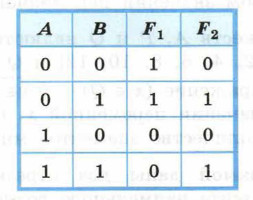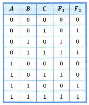 12. Сколько существует различных логических функций от четырёх переменных? 13. По заданной таблице истинности составьте логические выражения для функций F1, F2.