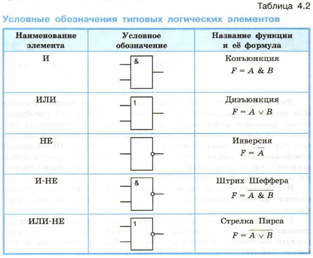 Работу любого логического элемента математически удобно описать как логическую функцию, которая упорядоченному набору из нулей и единиц ставит в соответствие значение, также равное нулю или единице. В схемотехнике широко используются логические элементы, представленные в таблице 4.2.