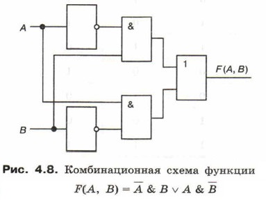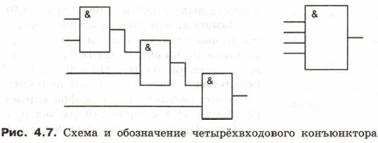 Опишите подобным образом логические элементы ИЛИ (дизъюнктор), НЕ (инвертор), И-НЕ, ИЛИ-НЕ. Однотипность сигналов на входах и выходах позволяет подавать сигнал, вырабатываемый одним элементом, на вход другого элемента. Это позволяет из двухвходовых элементов «собирать» многовходовые элементы (рис 4.7), а также синтезировать произвольные комбинационные схемы, соединяя в цепочки отдельные логические элементы.