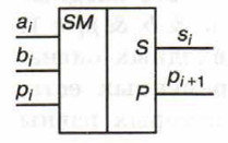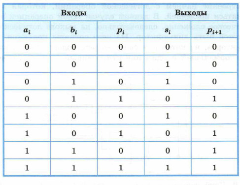 Заметим, что при сложении цифр в i-м разряде мы должны сложить цифру ai числа а, цифру bi числа b, а также pi — перенос из (i - 1)-го разряда. В результате сложения должны получиться цифра результата si и цифра переноса (0 или 1) в следующий разряд pi+1. Основываясь на этих рассуждениях, построим таблицу истинности для функций, которые в зависимости от цифр ai, bi и pi получают цифры si, и pi+1.