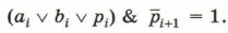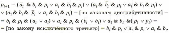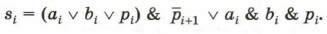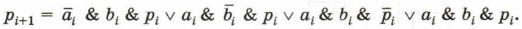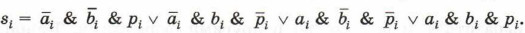 Полученное выражение означает, что функция pi+1 принимает значение 1 только для таких комбинаций входных переменных, когда хотя бы две переменные имеют единичные значения. Обратите внимание на то, что такой вывод можно сделать и в результате анализа таблицы истинности. По таблице истинности можем записать выражение для si: