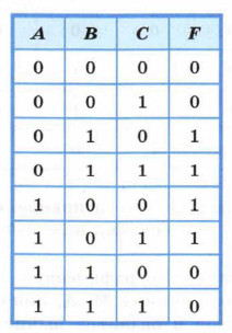 7. Пусть в некотором конкурсе вопрос о допуске того или иного участника к следующему туру решается тремя членами жюри: А, В и С. Решение положительно тогда и только тогда, когда хотя бы двое членов жюри высказываются за допуск, причём среди них обязательно должен быть председатель жюри А. Необходимо разработать устройство для голосования, в котором каждый член жюри нажимает на одну из двух кнопок — «За» или «Против», а результат голосования всех трёх членов жюри определяется по тому, загорится (участник допускается) или нет (участник не допускается) сигнальная лампочка. Составьте схему устройства, которое на выходе выдавало бы 1, если участник допускается к следующему туру, и 0, если не допускается.