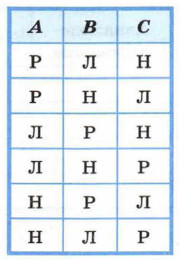 Кто такие А, B и С? Для решения этой задачи следует рассмотреть все возможные варианты распределения ролей. Начнём с А. Он может быть рыцарем (Р), лжецом (Л) или нормальным человеком (Н). Если А — рыцарь, то B может быть лжецом или нормальным человеком и т. д. Представим все варианты распределения ролей в таблице: