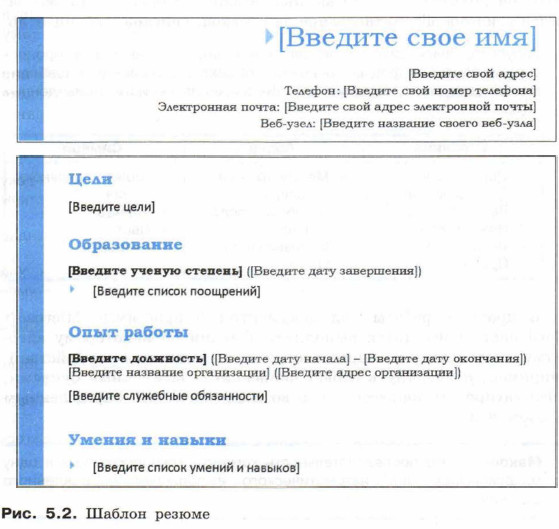 Пользователю достаточно ввести свою информацию в отдельные блоки шаблона, и она автоматически приобретёт заранее заданное оформление. В недалёком будущем каждому из вас для поиска подходящей работы придётся составить и разослать резюме. Подготовить его лучше всего с использованием соответствующего шаблона (рис. 5.2).