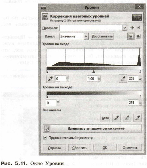 § 24. Объекты компьютерной графики 24.4. Цифровые фотографииВ большинстве современных графических редакторов у пользователя есть возможность посмотреть распределение количества пикселей изображения по их яркости. Откройте диалоговое окно Уровни (Цвет → Уровни...) (рис. 5.11).