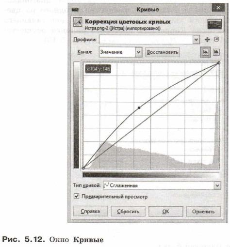 Гистограмма в центральной части окна показывает распределение количества пикселей изображения по их яркости. По горизонтальной оси гистограммы откладываются значения яркости пикселя от нуля до 255. Высота вертикальных отрезков (вертикальная ось) определяется количеством пикселей, имеющих одинаковую яркость. Проследите за изменениями, происходящими с фотографией, при перемещении чёрного, серого и белого движков (треугольников) под гистограммой. Вы можете корректировать всё изображение, а можете работать с одним из трёх цветовых каналов, выбрав соответствующее значение из выпадающего списка Канал, размещённого над гистограммой. Параметры, изменяемые в процессе коррекции цветовых уровней, можно представить как кривые (рис. 5.12) — соответствующая кнопка размещена в нижней части окна Уровни.