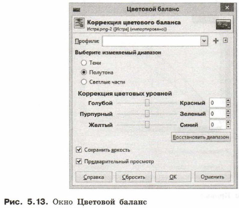 Более сложную обработку изображения можно произвести с помощью коррекции цветов. Специфика работы с цветом заключается в том, что изменение одного из них обязательно отражается на других. Поэтому в основе любой цветовой коррекции лежит не настройка отдельных цветов, а настройка цветового баланса. Она реализуется с помощью цветовой модели HSB, о которой рассказывалось в § 15. Цветовой круг, о котором там шла речь, наглядно представляет взаимосвязь цветов: каждый цвет находится напротив дополняющего его на другом конце диагонали. Уменьшая содержание в некотором изображении одного из цветов, мы автоматически увеличиваем содержание дополняющего его цвета. Вызов окна Коррекция цветового баланса осуществляется командой Цвет → Цветовой баланс... (рис. 5.13).