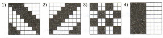 8. Что такое формат графического файла? Предложите классификацию известных вам форматов графических файлов. 9. В связи с чем в графических форматах применяются алгоритмы сжатия? 10. Какая из следующих картинок будет иметь самый короткий код при сжатии алгоритмом RLE1? 1 По материалам международного конкурса по информатике «Бобёр».