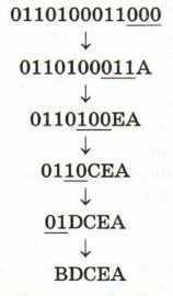 Для имеющихся кодов выполняется обратное условие Фано: никакой код не является окончанием другого кода. Следовательно, имеющуюся двоичную строку можно декодировать однозначно, если начать её декодирование с конца (справа налево). Итак, направление однозначного декодирования установлено. Процесс декодирования может быть представлен так: