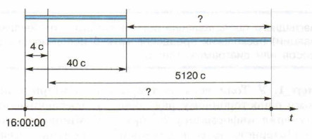 Каков минимально возможный промежуток времени (в секундах) с момента завершения скачивания данных Толей до полного их получения Мишей? Как скоро Миша сможет полностью получить все данные, если Толя начнёт их скачивание в 16:00? В этой задаче мы имеем дело с двумя процессами передачи информации, осуществляемыми с разной скоростью. 1. Процесс скачивания информации Толей по высокоскоростному каналу. Длительность этого процесса 5 • 233/220 = 5 • 23 = 40 с. 2. Процесс скачивания информации Мишей по низкоскоростному каналу. Длительность этого процесса 5 • 223/213 = 5 • 210 = 5120 с.