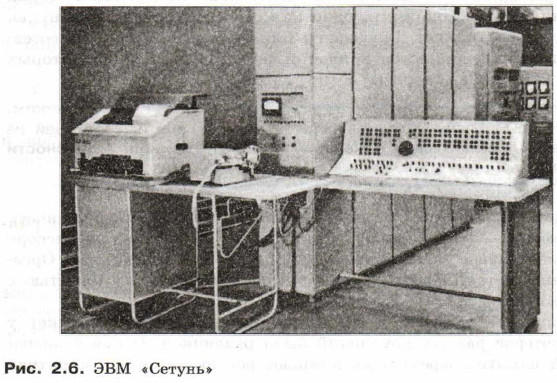 В 1958 г. в Московском государственном университете им. М. В. Ломоносова под руководством Н. П. Брусенцова был создан троичный компьютер «Сетунь» (рис. 2.6). В нём применялась уравновешенная троичная система счисления, использование которой впервые в истории позволило представлять одинаково просто как положительные, так и отрицательные числа.