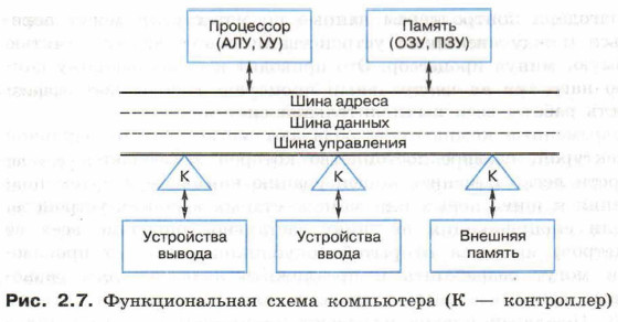 На рисунке 2.7 изображены хорошо известные вам узлы современного компьютера: процессор, внутренняя память, устройства ввода, устройства вывода и внешняя память. Обмен данными между устройствами компьютера осуществляется с помощью магистрали.