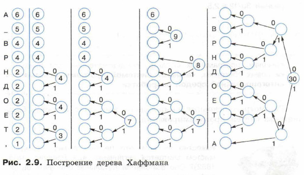 Алгоритм построения дерева Хаффмана следующий. 1. Считаем частоты встречаемости символов рассматриваемой фразы вершинами будущего графа (дерева). Выписываем их вертикально в ряд. 2. Выбираем две вершины с наименьшими весами (они соответствуют символам с наименьшим количеством повторений). Объединяем эти вершины — создаём новую вершину, от которой проводим рёбра к выбранным вершинам с наименьшими весами, а вес новой вершины задаём равным сумме их весов. Расставляем на рёбрах графа числа 0 и 1: на верхнем ребре — 0, а на нижнем — 1. Чтобы выбранные вершины больше не просматривались, стираем их веса. 3. Продолжаем выполнять объединение вершин, каждый раз выбирая пару с наименьшими весами, до тех пор, пока не останется одна вершина — корень дерева. Заметим, что вес этой вершины будет равен длине сжимаемого массива. Процесс построения дерева Хаффмана для нашего примера изо бражён на рисунке 2.9.