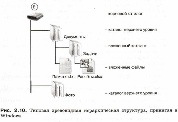 § 9. Файловая система компьютера Файловые структурыСовокупность файлов на диске и взаимосвязей между ними называют файловой структурой диска. Первоначально файловые системы поддерживали только одноуровневые файловые структуры: все файлы хранились в одном каталоге. Для хранения большого (сотни и тысячи) количества файлов используются иерархические (многоуровневые) файловые структуры: файлы группируются в каталоги, каталоги могут группироваться в каталоги более высокого уровня. Пользователь, объединяя по собственному усмотрению файлы в каталоги, может создать удобную для себя систему хранения информации. Графическое изображение иерархической файловой структуры называется деревом. Древовидные иерархические структуры можно изображать вертикально и горизонтально (рис. 2.10).