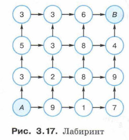 Полученные в результате работы алгоритма метки вершин графа — это и есть кратчайшие расстояния от вершины А до каждой из этих вершин. Метод динамического программирования основан на том, что процесс решения задачи разбивается на стадии (шаги), на каждой из которых принимаются решения, приводящие к достижению поставленной цели. Предположим, персонажу некоторой игры необходимо пройти по лабиринту из пункта А в пункт В, набрав при этом как можно меньше штрафных баллов, количество которых указано в клетках лабиринта, причём перемещаться можно только вверх или вправо. С помощью графа начальные условия могут быть заданы так, как показано на рисунке 3.17.