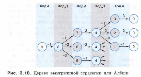 На рисунке 3.18 в форме дерева представлена выигрышная стратегия для Алёши. Поэтому для Алёши всегда указывается один ход («Ход А»), обеспечивающий требуемый результат. А вот для Добрыни, фактически выступающего в качестве соперника, рассматриваются все возможные варианты («Ход Д»).
