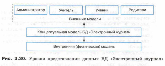 В каждой школе нашей страны используется БД «Электронный журнал». Схему уровней представления данных для этой БД вы видите на рисунке 3.30.