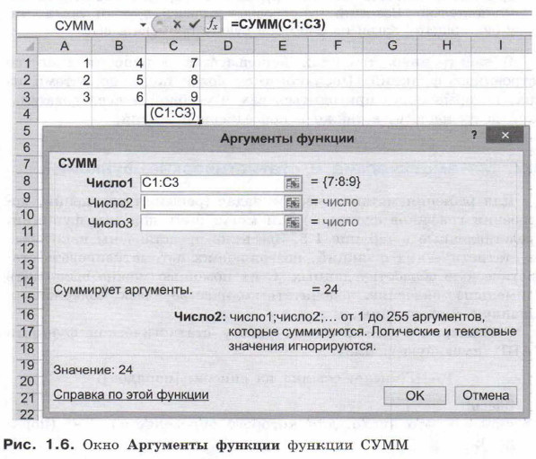 Если функция имеет фиксированное количество аргументов, то в окне Аргументы функции сразу отображается соответствующее количество полей для их ввода. Если функция имеет нефиксированное количество аргументов, то в окне сначала появляется несколько полей, а следующие поля появляются уже в процессе ввода аргументов. Если аргументом является число или текст, то его нужно вводить в поле с клавиатуры. Если аргументом является ссылка на ячейки, то её также можно ввести с клавиатуры, но лучше выделить соответствующие ячейки с помощью мыши. Для этого: 1) выберите кнопку Свернуть 2) выделите нужные ячейки (ссылки на них автоматически вставятся в соответствующее поле и в формулу); 3) выберите кнопку Развернуть (после этого окно Аргументы функции примет свой предыдущий вид); 4) при необходимости повторите шаги 1-3 для других аргументов функции; 5) после ввода в поля всех нужных аргументов функции выберите кнопку ОК. Для некоторых функций Microsoft Excel автоматически предлагает первый аргумент. Например, для функции СУММ предлагается найти сумму чисел диапазона ячеек, заполненных числовыми данными, которые находятся над ячейкой с формулой (см. рис. 1.6) или слева от неё, если верхний диапазон ячеек пуст. Это предложение можно принять (если оно соответствует плану проводимых вычислений) или ввести вместо автоматически предложенного аргумента другой.