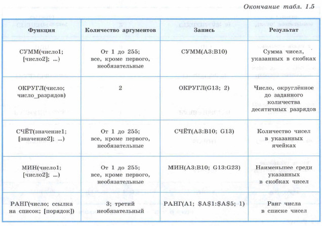 § 3. Встроенные функции и их использование Математические и статистические функцииДля решения математических задач (решения уравнений, построения графиков функций) вам могут быть полезны функции, представленные в таблице 1.5. Здесь же представлены некоторые из статистических функций, позволяющих автоматизировать статистическую обработку данных. С их помощью можно вычислить наименьшее значение, подсчитать количество ячеек, содержащих заданную информацию, и т. д.
