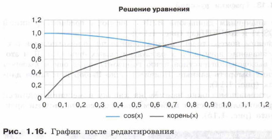 В результате построения графиков функций видно, что корень уравнения приблизительно равен 0,64. Построенную диаграмму можно редактировать: