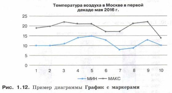 Сколько круговых диаграмм потребуется для того, чтобы изобразить информацию, представленную на гистограмме с накоплением (см. рис. 1.10)? Диаграммы типа График целесообразно использовать, если количество данных в наборе достаточно большое, если нужно отобразить динамику изменения данных во времени, сравнить изменения нескольких рядов данных (рис. 1.12).