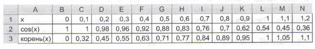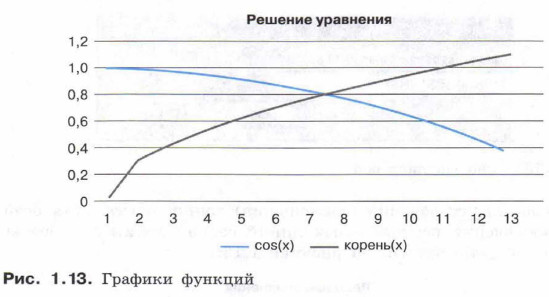 2) по значениям диапазона B2:N3 построим графики функций COS(x) и КОРЕНЬ(х) (рис. 1.13);