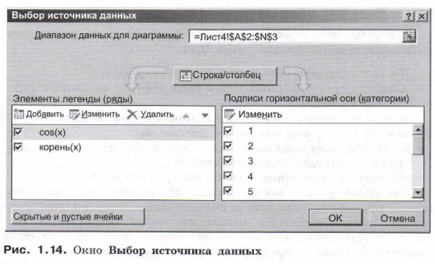 3) заменим номера точек, проставленные по горизонтальной оси, на значения аргумента х рассматриваемых функций. Для этого вызовем контекстное меню горизонтальной оси и выберем пункт Выбрать данные. Появится окно Выбор источника данных (рис. 1.14).