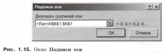 В открывшемся окне нажмём на кнопку изменения подписей горизонтальной оси и выберем диапазон со значениями аргумента (рис. 1.15).