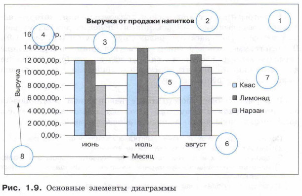 В диаграмме любого типа можно выделить следующие объекты (рис. 1.9): 1 — область диаграммы (в ней размещаются все объекты диаграммы); 2 — название диаграммы, чётко описывающее то, что представлено на диаграмме; 3 — область построения диаграммы (непосредственно в ней располагается сама диаграмма); 4 — ось значений (вертикальная, ось Y). На ней находится шкала с определённым шагом, устанавливаемым автоматически, в зависимости от наименьшего и наибольшего значений данных, изображённых на диаграмме. Именно по этой шкале можно оценить данные, представленные на диаграмме; 5 — ряды данных — наборы числовых данных, некоторым образом связанных между собой и размещённых в электронной таблице в одной строке или столбце. На диаграмме ряд данных изображается геометрическими фигурами одного вида и цвета; 6 — ось категорий (горизонтальная, ось X). На ней отображаются значения определённого свойства данных; 7 — легенда, поясняющая соответствие между названиями рядов и используемыми на диаграмме цветами. По умолчанию названия рядов являются названиями строк (или столбцов) диапазона данных, по которым построена диаграмма; 8 — названия осей.