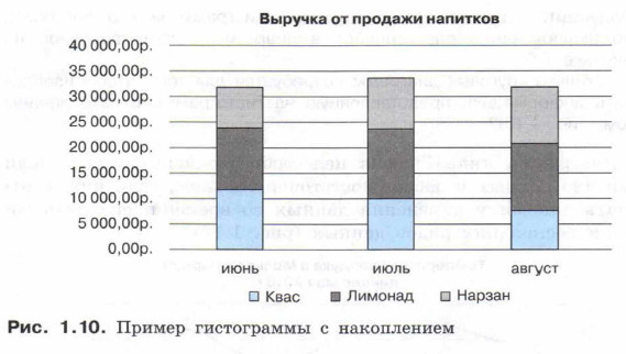 В гистограмме с группировкой прямоугольники, которые являются графическими изображениями числовых данных из разных наборов, располагаются рядом друг с другом (см. рис. 1.9). В гистограмме с накоплением прямоугольники, изображающие числовые данные, располагаются друг над другом (рис. 1.10). Это даёт возможность оценить суммарные данные и вклад каждой составляющей в общую сумму.