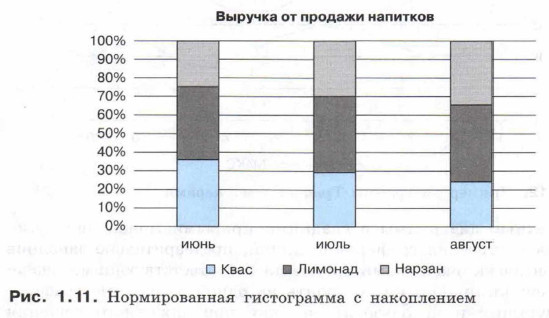 В нормированной гистограмме с накоплением вертикальная ось имеет шкалу в процентах. Это даёт возможность оценить долю (процентную часть) данных в общей сумме (рис. 1.11).