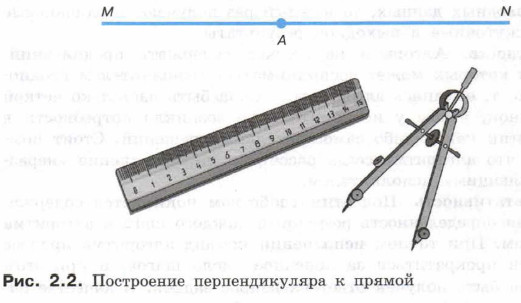 Опишем метод построения перпендикуляра к прямой MN, проходящего через заданную точку А этой прямой, с помощью линейки и циркуля (рис. 2.2): 1) отложить в обе стороны от точки А на прямой MN циркулем отрезки равной длины с концами B и С; 2) увеличить раствор циркуля до радиуса, в полтора-два раза больше длины отрезков АВ и АС; 3) провести указанным раствором циркуля дуги окружностей с центрами в точках B и С так, чтобы они охватили точку А и образовали две точки пересечения друг с другом (D и Е); 4) взять линейку, приложить её к точкам D и E и соединить их отрезком; при правильном построении отрезок пройдёт через точку А и будет являться перпендикуляром к прямой MN.