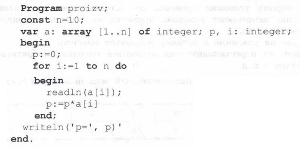 1) Что получится в результате выполнения этой программы, если в качестве элементов массива ввести числа: 1, -2, 3, -4, 5, -6, 7, -8, 9, -10? 2) Придумайте пример такого массива, обработка которого с помощью этой программы приводила бы к правильному результату. 3) Найдите ошибку, допущенную программистом.