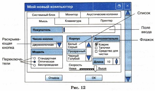 § 4. Управление компьютером Что можно выбрать в компьютерном менюРазличают (по способу перехода к ним) раскрывающиеся и контекстные меню. Чтобы открыть раскрывающееся меню, щёлкают на его названии в строке меню. Контекстное (всплывающее) меню какого-либо объекта вызывается щелчком правой кнопкой мыши на этом объекте. Любое меню содержит список команд, которые можно дать компьютеру. Выбор команды производится щелчком кнопкой мыши. Пункт меню, изображённый серым цветом, недоступен. Если на нём щёлкнуть, ничего не произойдёт. Рядом с некоторыми пунктами меню имеются дополнительные символы. Чёрный треугольник-стрелка означает, что данный пункт открывает вход в следующее меню. Многоточие после пункта означает, что перед выполнением команды у пользователя будет запрошена дополнительная информация. Флажок («галочка»), стоящий перед пунктом меню, означает, что этот пункт уже выбран (включён). Щелчок на нём позволяет его отключить. Некоторые пункты меню кроме названия команды содержат обозначения клавиатурных комбинаций. Это означает, что данный пункт можно вызвать не только мышью, но и одновременным нажатием указанных клавиш клавиатуры. При выборе пункта меню, в котором за именем команды следует многоточие, открывается диалоговое окно (рис. 12). Оно позволяет передать компьютеру более подробную информацию о сделанном выборе с помощью элементов управления: полей ввода, списков и раскрывающихся списков, переключателей, флажков, вкладок, кнопок и др.