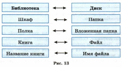 Каждый файл хранится в папке или во вложенной папке (папка, расположенная внутри папки). Пусть, например, на жёстком диске компьютера записано несколько игр. Игра представляет собой набор файлов. Каждая игра хранится в отдельной папке, при этом все папки с играми для удобства могут быть вложены в одну общую папку с именем «Игры». Система хранения файлов напоминает хранение большого количества книг в библиотеке (рис. 13).