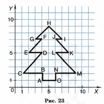 Пример. Известны координаты 15 точек: А(4, 1), В(4, 2), С(1, 2), D(4, 5), Е(2, 5), F(4, 7), G(3, 7), Н(5, 9), I(7, 7), J(6, 7), К(8, 5), L(6, 5), М(9, 2), N(6, 2), O(6, 1). Если отметить эти точки на координатной плоскости, а затем соединить их отрезками в последовательности А — В — С — D — Е — F — G — Н — I — J — К — L — М — N — О — А, то получим рисунок 23.