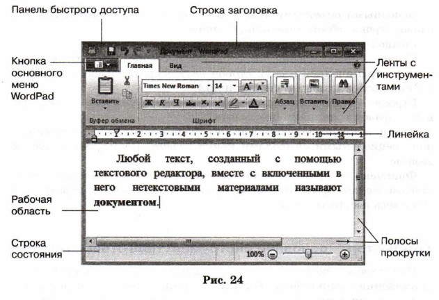 § 8. Текстовая информация Компьютер — основной инструмент подготовки текстовПодготовка текстов — одна из самых распространённых сфер применения компьютеров. На любом компьютере установлены специальные программы, предназначенные для создания текстов, — текстовые редакторы. Вы уже работали с простым текстовым редактором. С его помощью можно создавать простые тексты, состоящие из букв, цифр, знаков препинания и специальных символов, которые можно ввести с помощью клавиатуры. Для создания и оформления рассказов, докладов, статей для школьной газеты, содержащих надписи, таблицы, схемы, рисунки, фотографии, используют более мощные текстовые редакторы. Их ещё называют текстовыми процессорами. Окно одного из простых текстовых процессоров показано на рис. 24. Подготовка документа на компьютере состоит из таких этапов, как ввод (набор), редактирование, форматирование и печать.