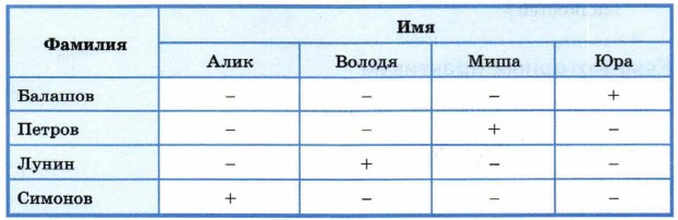 — Ну, Балашов, ты, наконец, научился плавать? — спросил Володя. — О, ещё как, — ответил Балашов, — могу теперь потягаться в плавании с тобой и Аликом. — Посмотрите, какой я гербарий собрал, — сказал Петров, прерывая разговор друзей, и достал из шкафа большую папку. Всем, особенно Лунину и Алику, гербарий очень понравился. А Симонов обещал показать товарищам собранную им коллекцию минералов. Назовите имя и фамилию каждого мальчика. Решение Составим таблицу, где заголовки строк — это фамилии друзей, а заголовки столбцов — их имена. В ячейке будем ставить знак «плюс», если фамилия и имя из соответствующих строки и столбца принадлежат одному человеку, и знак «минус» в противном случае.