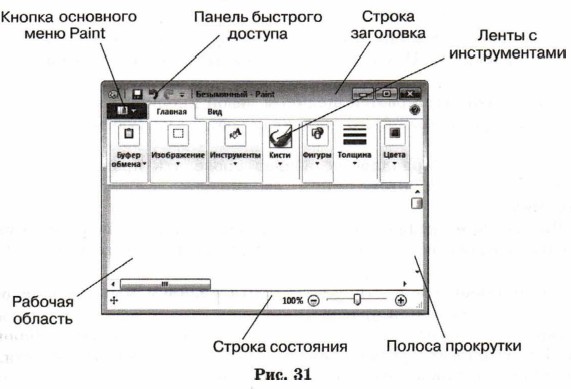 § 11. Компьютерная графика Графический редакторГрафический редактор — это программа, предназначенная для создания картинок, поздравительных открыток, рекламных объявлений, приглашений, иллюстраций к докладам и других изображений. После запуска графического редактора Paint на экране компьютера открывается его окно, основные элементы которого показаны на рис. 31.
