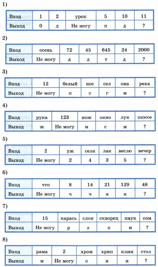 Победителем какой олимпиады стал каждый из этих ребят? 17. Некое устройство (назовём его «чёрный ящик») настраивается на одну из восьми программ преобразования числовой или текстовой информации. Проанализировав приведённые ниже протоколы испытаний, определите для каждой из 8 программ вид информации и правило её преобразования. Что следует записать в протоколе вместо знака «?»?